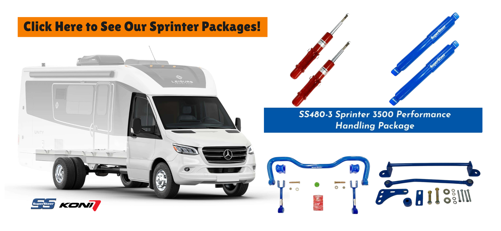 Our Learning Center can help you determine what recreational vehicle parts are going to help you the most. Whether you bought a Class A motorhome Ford F53, a Class C motorhome Sprinter or a Class C Ford E-Series, we’ve got you covered. We also have options available for diesel pusher chassis like Freightliner and Spartan. We like to think of ourselves as a “one-stop-shop” for RV steering and suspension upgrades. Whether you are looking for sway bars, tow bars, shocks or related parts, you have come to the right place. We are known for performance RV steering and suspension replacement and upgrade parts. If you need to control sway, tighten up your steering, correct road wander, or are just looking to upgrade your shocks, we have a solution for you.